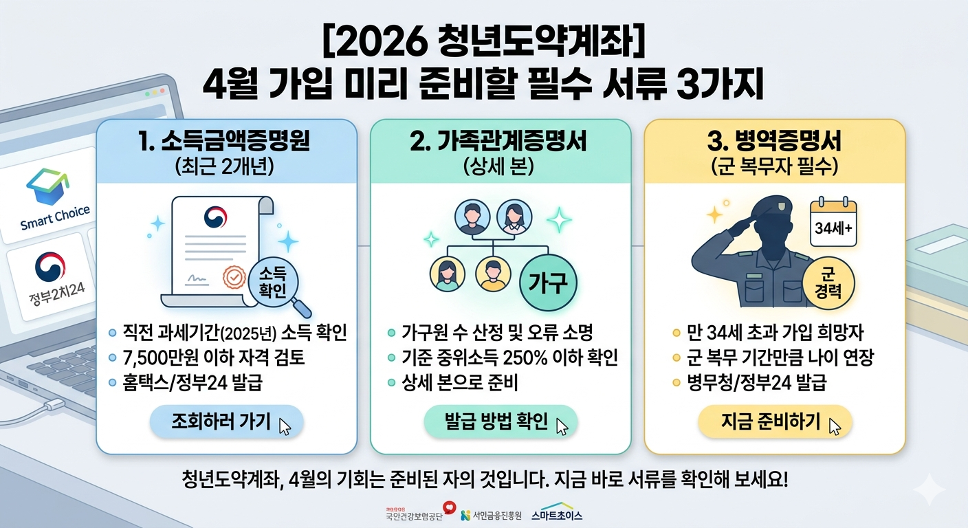 병역증명서 (해당자): 만 34세를 초과한 가입 희망자 중 군 복무 기간을 인정받아야 하는 분들은 필수입니다.